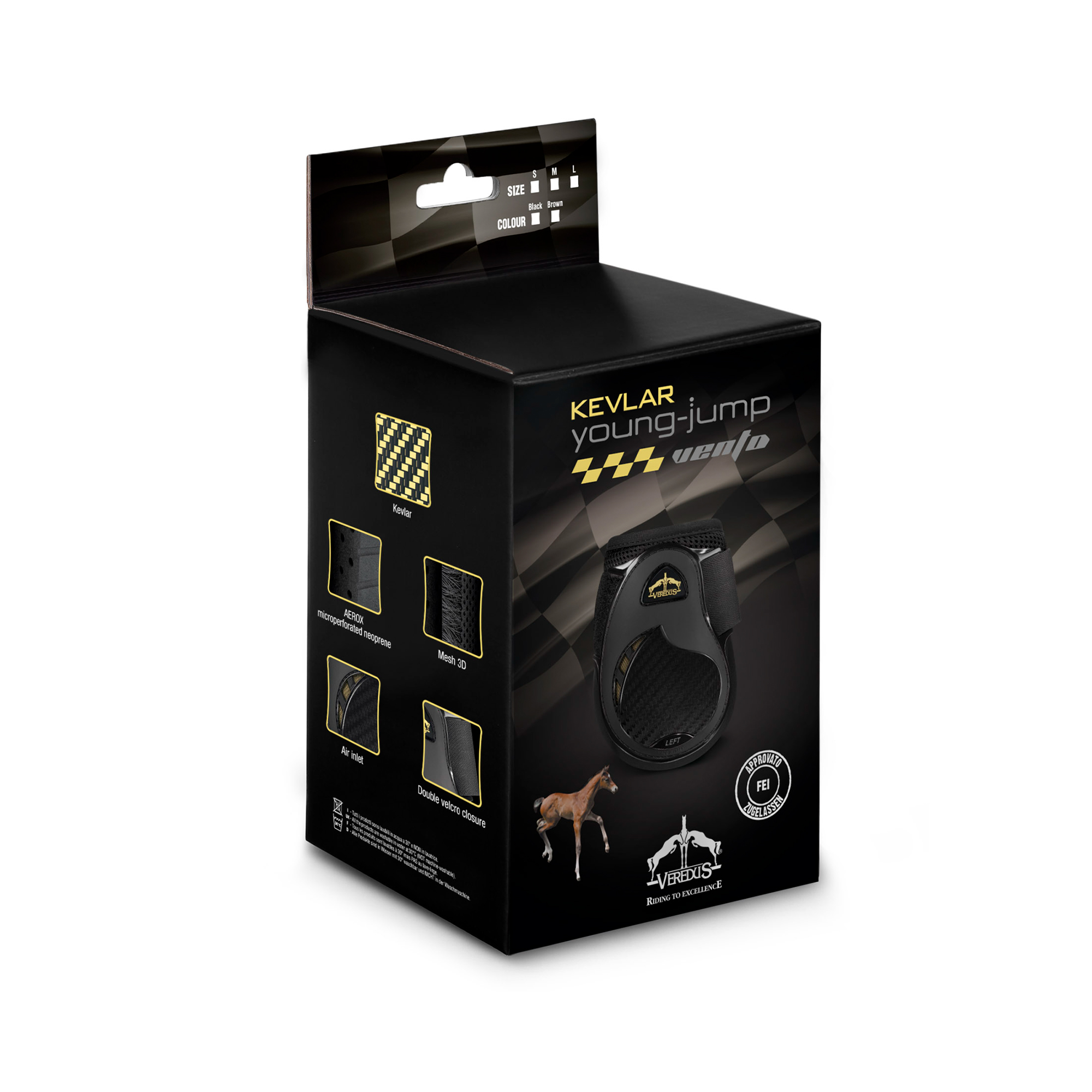 La Fédération Internationale a autorisé le protège-boulet Young Jump spécifiquement pour les jeunes chevaux et il peut également être utilisé sur des chevaux de tout âge. Les protections Kevlar® Gel Vento associent toute la technologie Veredus et la performance du Kevlar®. Le Kevlar ® est une fibre aramide hautement résistante aux chocs et aux frottements, légère, souple, durable et incroyablement robuste. La jambe du cheval est ainsi parfaitement protégée, grâce à la présence notamment d’une couche de Nitrixgel absorbeur de choc positionnée dans la partie arrière du protège-boulet. La technologie Vento garantit une ventilation optimale de la jambe.